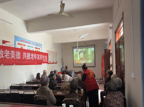 敬老宴开始前,陆营村为长者们准备了戏剧电影,老人们听得入迷,不时跟着节奏轻轻哼唱。宴会现场,身穿统一服装的志愿者成为一道亮丽的风景线。