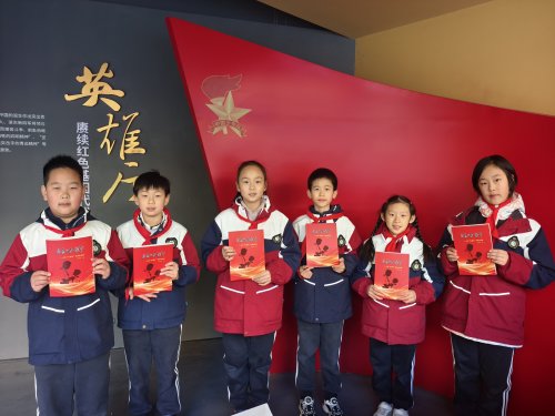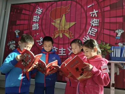 宁海艺术实验学校“观杰中队”队员在学校先锋广场英雄厅喜收新书