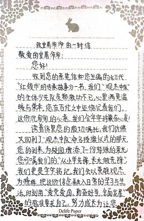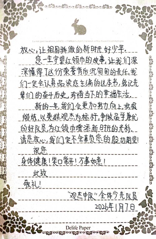 宁海艺术实验学校“观杰中队”致皇甫老师的回信 这或许就是《三代“红领巾”的传承故事》给予我们最深刻的启示:真正的传承,从来不是简单的重复,而是每一代人都用自己的方式,回答同一个永恒的问题——我们如何成为更好的人,如何建设更好的国家。当一条红领巾能够串起三代人的青春选择,当星星火炬在一户普通人家持续燃烧七十余载,我们就有理由相信:那些最宝贵的精神财富,永远不会随时间流逝,只会在传承中愈发璀璨。(作者简介: 姜新生,解放军报社原全媒体部主任、中国版权协会常务理事、姜鸿起烈士纪念馆名誉馆长等。) 编辑:蒋国辉 责编:曹道伟 审校:李全胜 值班:任安广