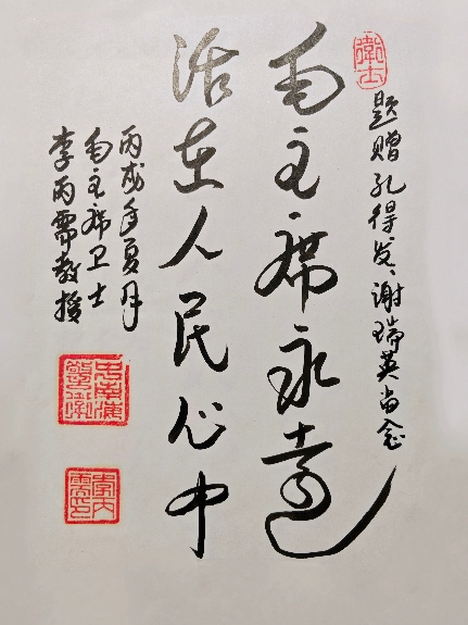 (2006年孔得发与李丙需老师合影留念) 李丙需叔叔,您或许已记不清我了。二十年前,我们曾相聚一堂,您亲笔题写的**“毛主席永远活在人民心中”**,我们至今珍藏完好、视若珍宝。请您放心,伟大领袖毛主席永远活在我们心中,红色精神代代相传、永不褪色!