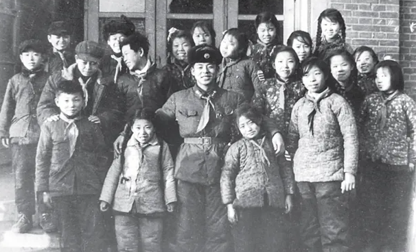 接任抚顺市建设街小学校外辅导员后,雷锋与少先队大队、中队干部们合影
