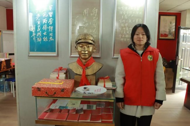 展柜中,一张泛黄的军旅照片格外引人注目。那是雷锋生前老班长刘景凤赠送的珍贵影像,记录着战友情深。还有河南大学教授亲手创作的剪纸画,线条细腻,将雷锋形象与中华传统艺术融为一体;一旁的油画色彩饱满,定格了雷锋在武汉大桥下的英姿,那是他少有的一张以现代建筑为背景的留影,铁桥坚固、江水奔流,映衬着年轻战士的意气风发。更有独一无二的文创瓷盘,盘面绘有“当代雷锋”庄仕华将军的肖像。庄仕华将军五十年如一日扎根新疆、服务各族群众,被誉为新时代的雷锋,将两代“雷锋”汇聚于瓷盘之上,寓意精神传承,生生不息。