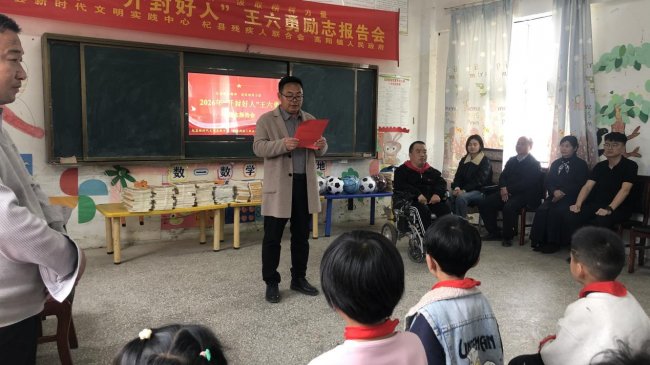 高阳镇中心学校党支部书记刘汉周发表热情洋溢的致辞。丁胜代表杞县残疾人联合会向学校捐赠作业本、铅笔、篮(足)球等学习和体育用品,并对此次报告会的成功举行表示祝贺!同时,对身残志坚、热心公益的王六勇给予充分肯定。