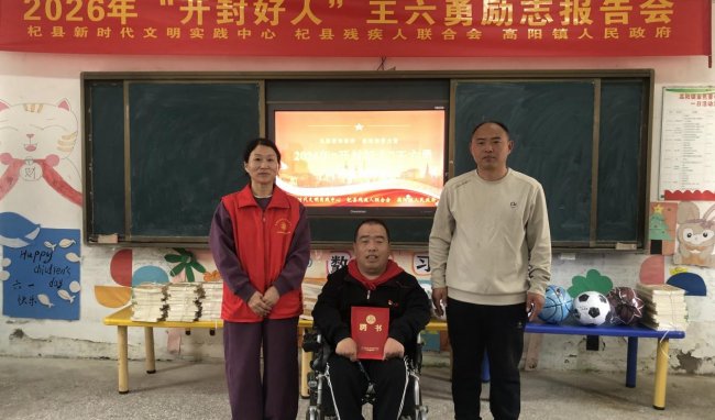 今年43岁的王六勇,是杞县高阳镇团城村人。他从小因病致残,却始终身残志坚,凭借顽强不屈的意志与乐观向上的人生态度,走出了一条不平凡的奋斗之路。在逆境中自强不息、砥砺成长,他常怀感恩之心,多年来深耕公益事业、帮扶困难群体,用实际行动诠释新时代奋斗者的责任与担当,先后荣获杞县教育热心人、开封市最美家乡人、开封好人、河南省孝贤之星、河南省十佳乡村光荣榜·志愿服务好标兵等荣誉。